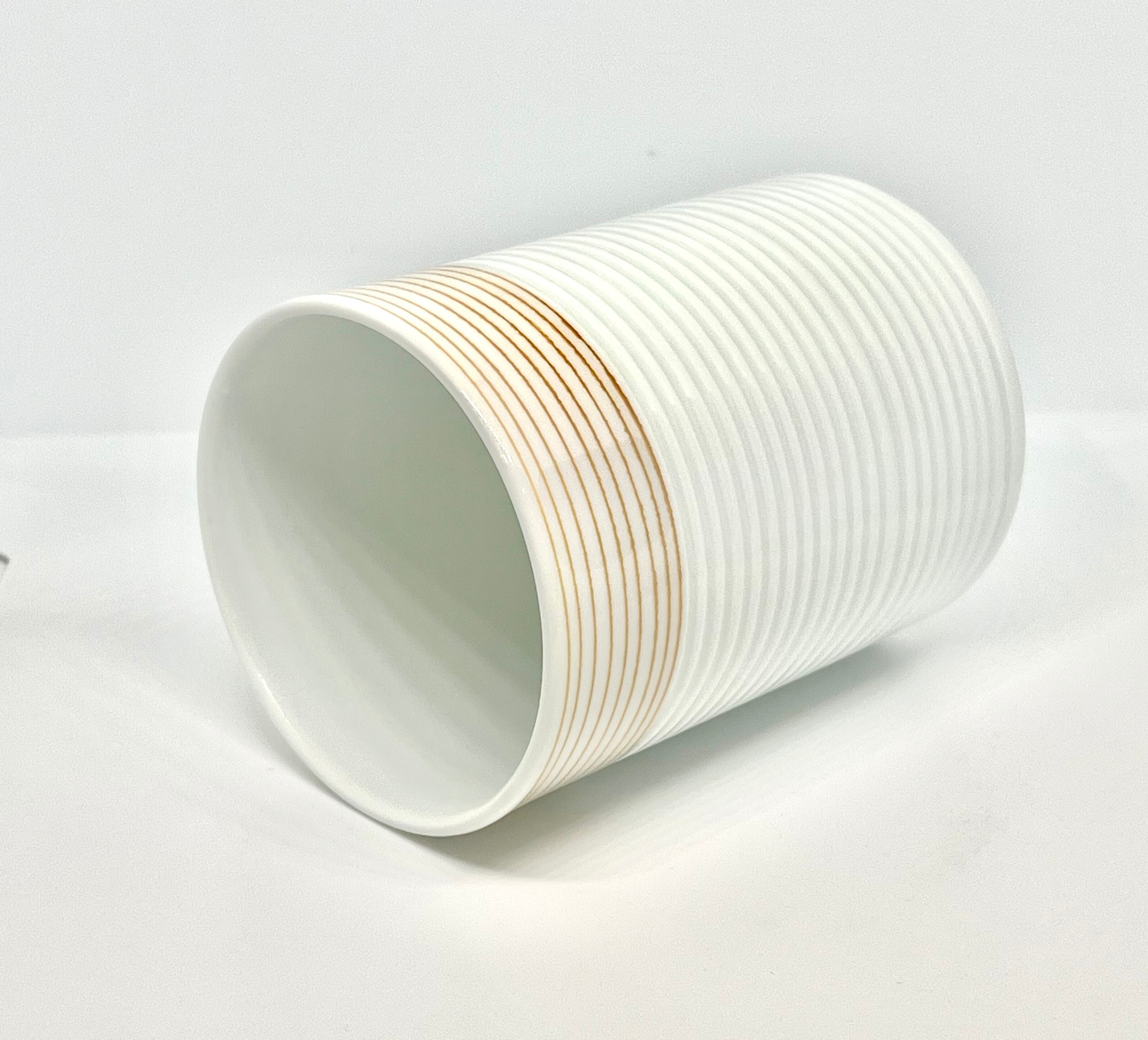 カップだけど用途はさまざま なんにでも使えるフリーカップはいかがでしょうか 飲み物用にはもちろん、ペン立てにも使えます 「今日はどのカップを使おうかな」と考え 食器棚を開けたとき、つい手がのびる一品です シンプルで持ちやすいように 溝の幅に変化をつけ彫ってあります 底面にも釉薬をかけていますのでテーブルに傷つけません